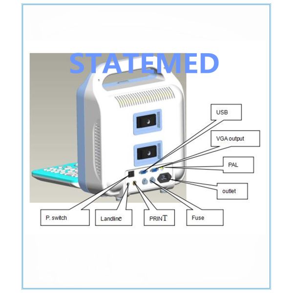 The instrument is consist of mainframe, probe and monitor,. It can be connected with medical image work station, printer, and color monitor. The scanning modes are electron convex array and electron liner array. The main probe is 3.5MHz(R=60) Electronic Convex Array, the selective probe are 6.5 Electronic Convex Array(housing R=13)and7.5 MHz surface probe.