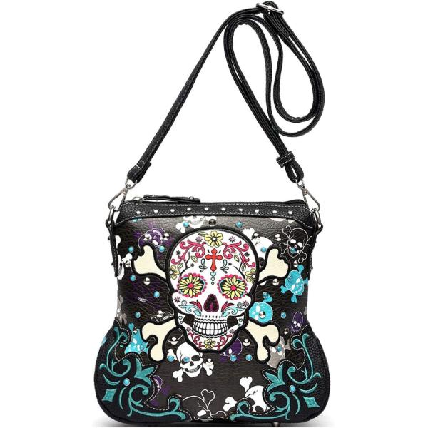 SUGAR SKULL DAY OF THE DEAD CROSS BONE ROCK METALLIC PURSE SKELETON LEATHER PURSE WOMEN CROSSBODY HANDBAG SHOULDER BAG
